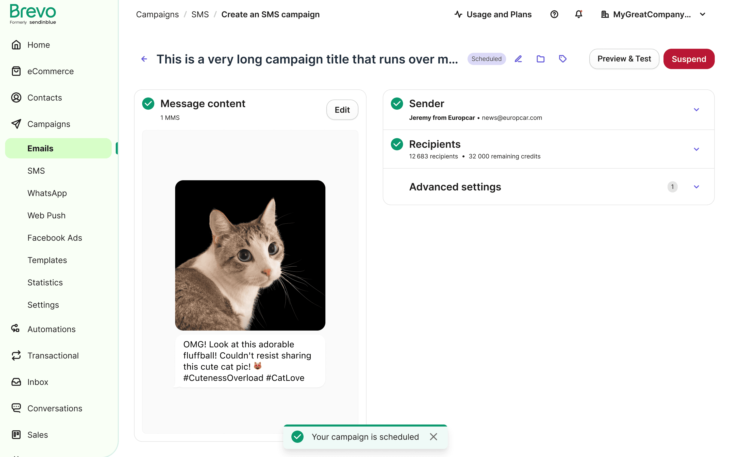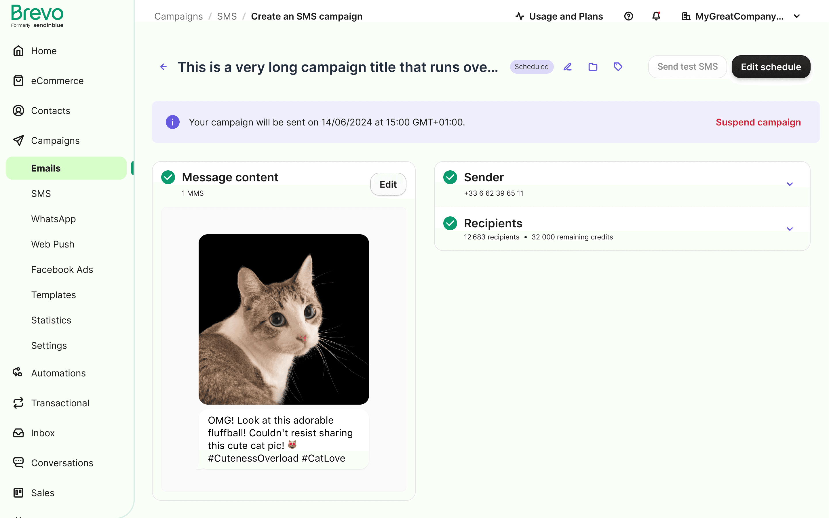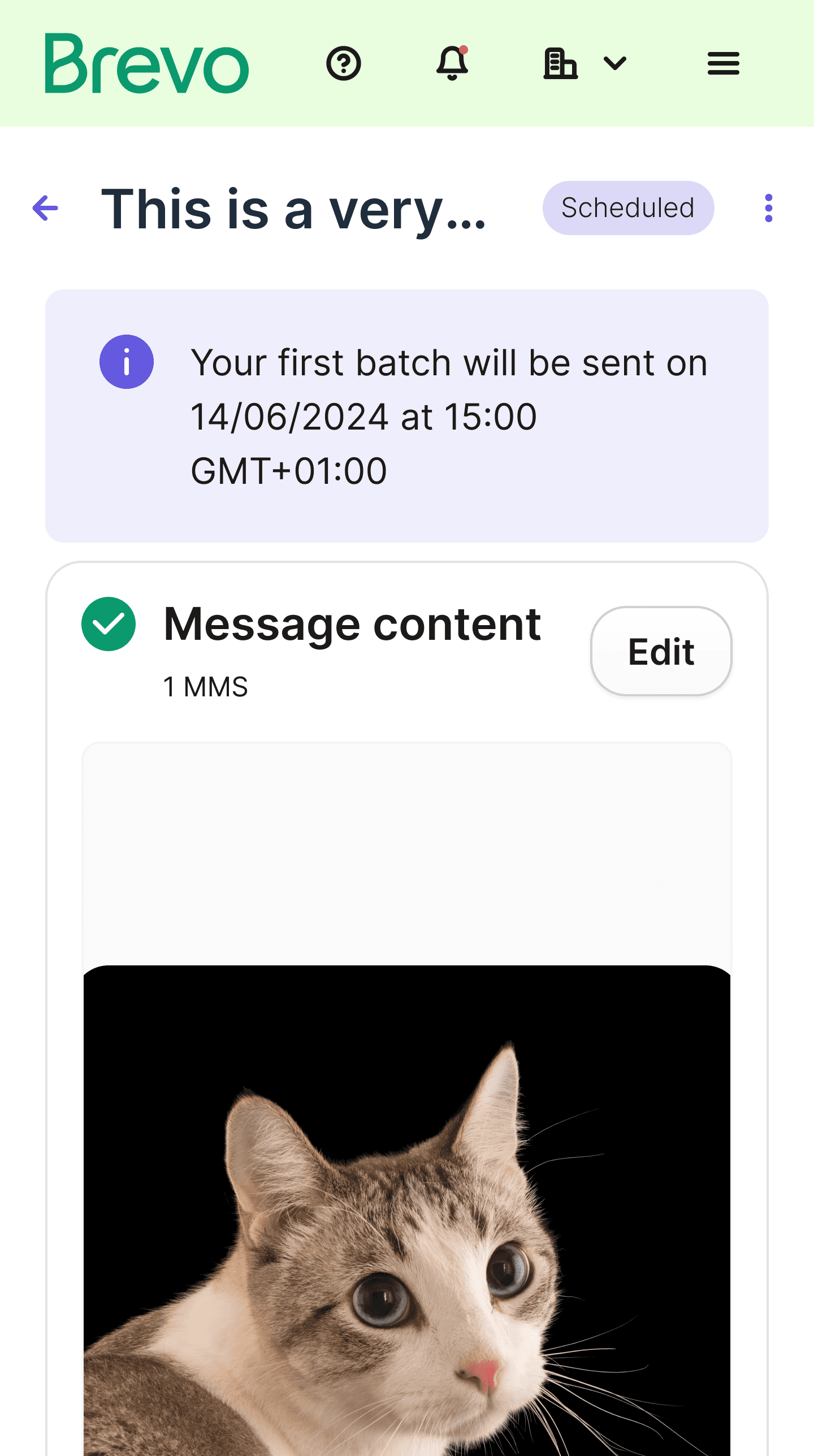 When a campaign is scheduled, we added an info card to display scheduling details, and the "Schedule" button changes to "Edit Schedule," enabling users to make late modifications.