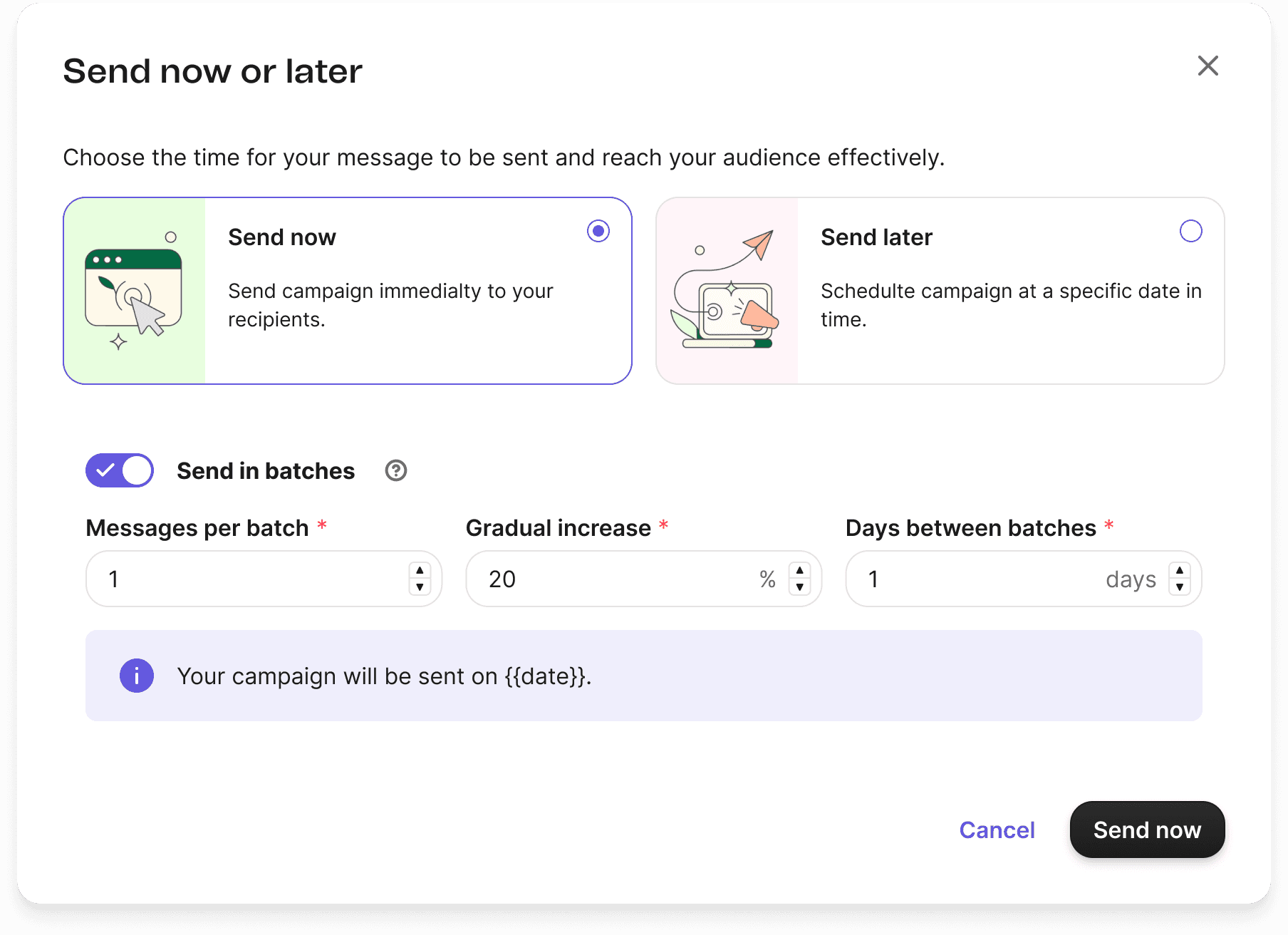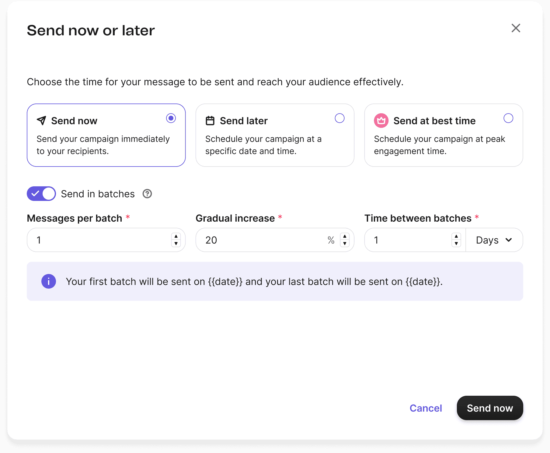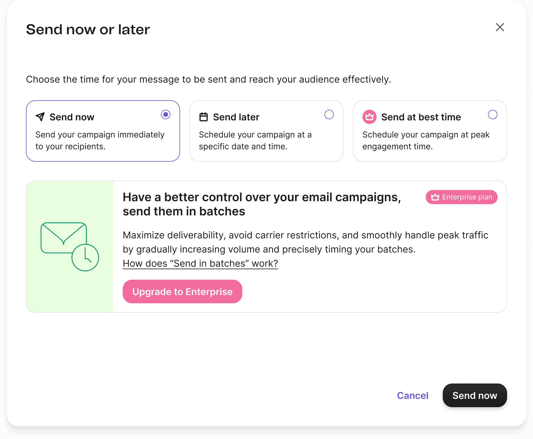 We removed the images, made "Send in Batches" a premium feature, and added descriptions in the radio cards to enhance user awareness and clarify the value proposition.