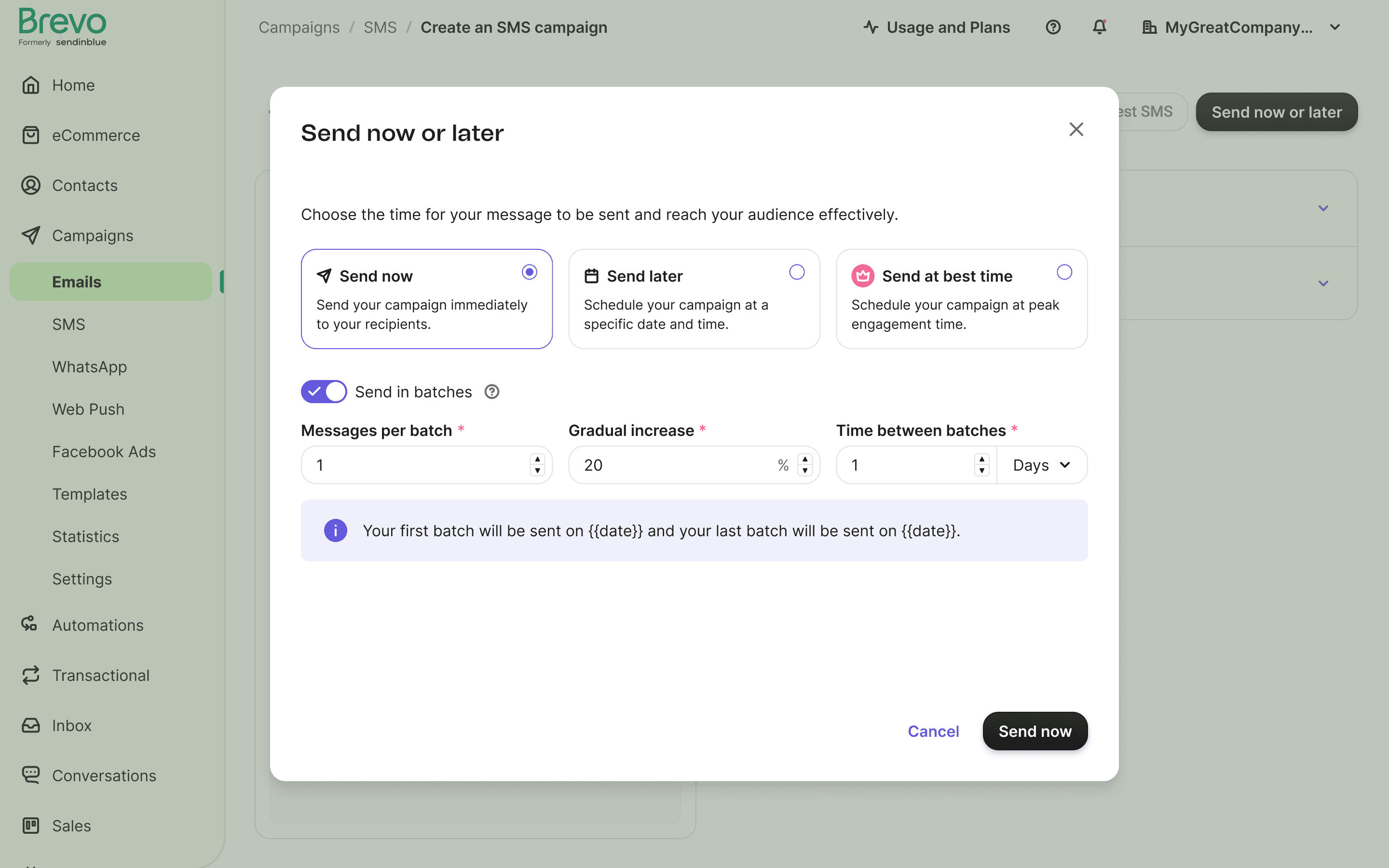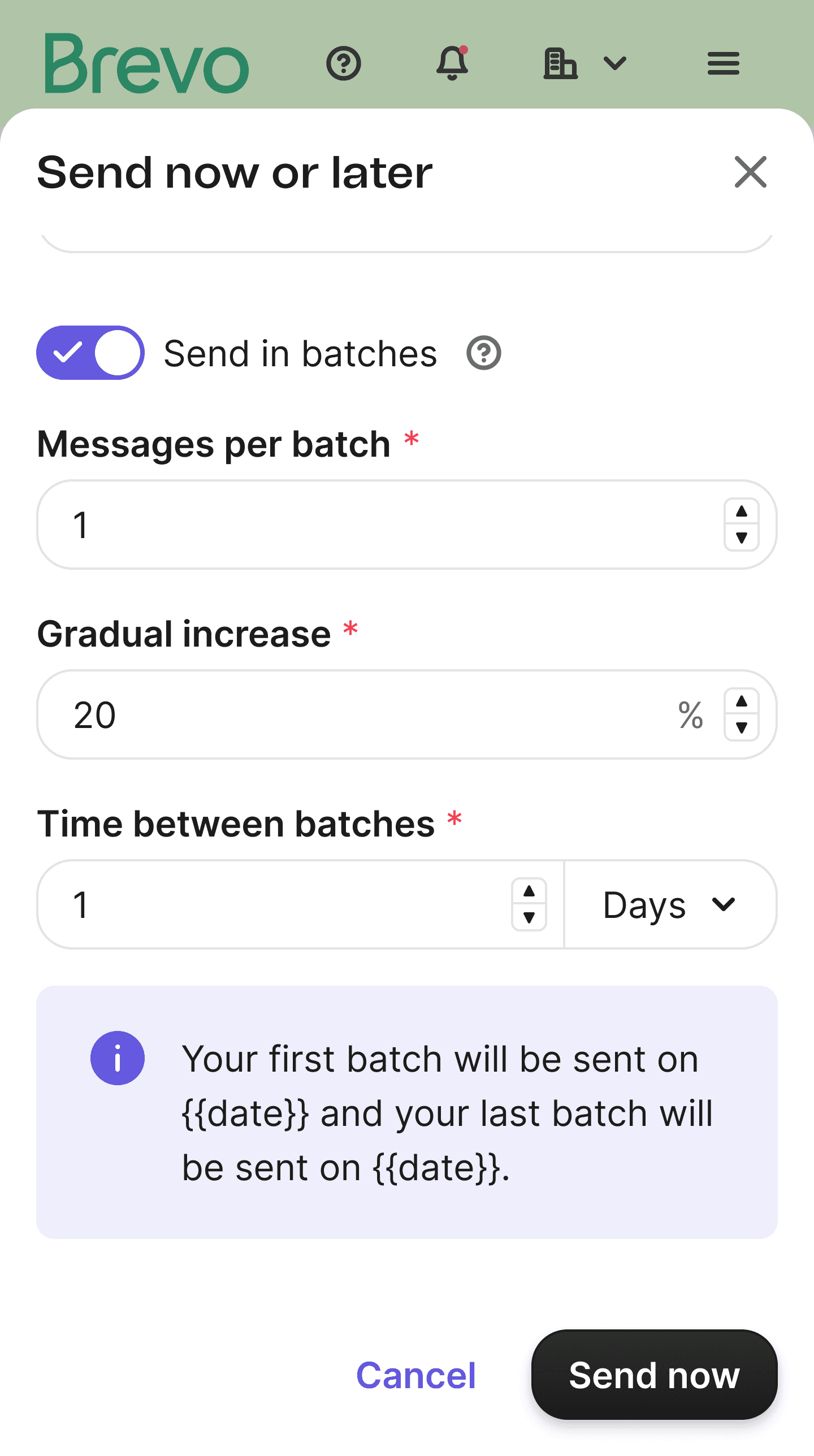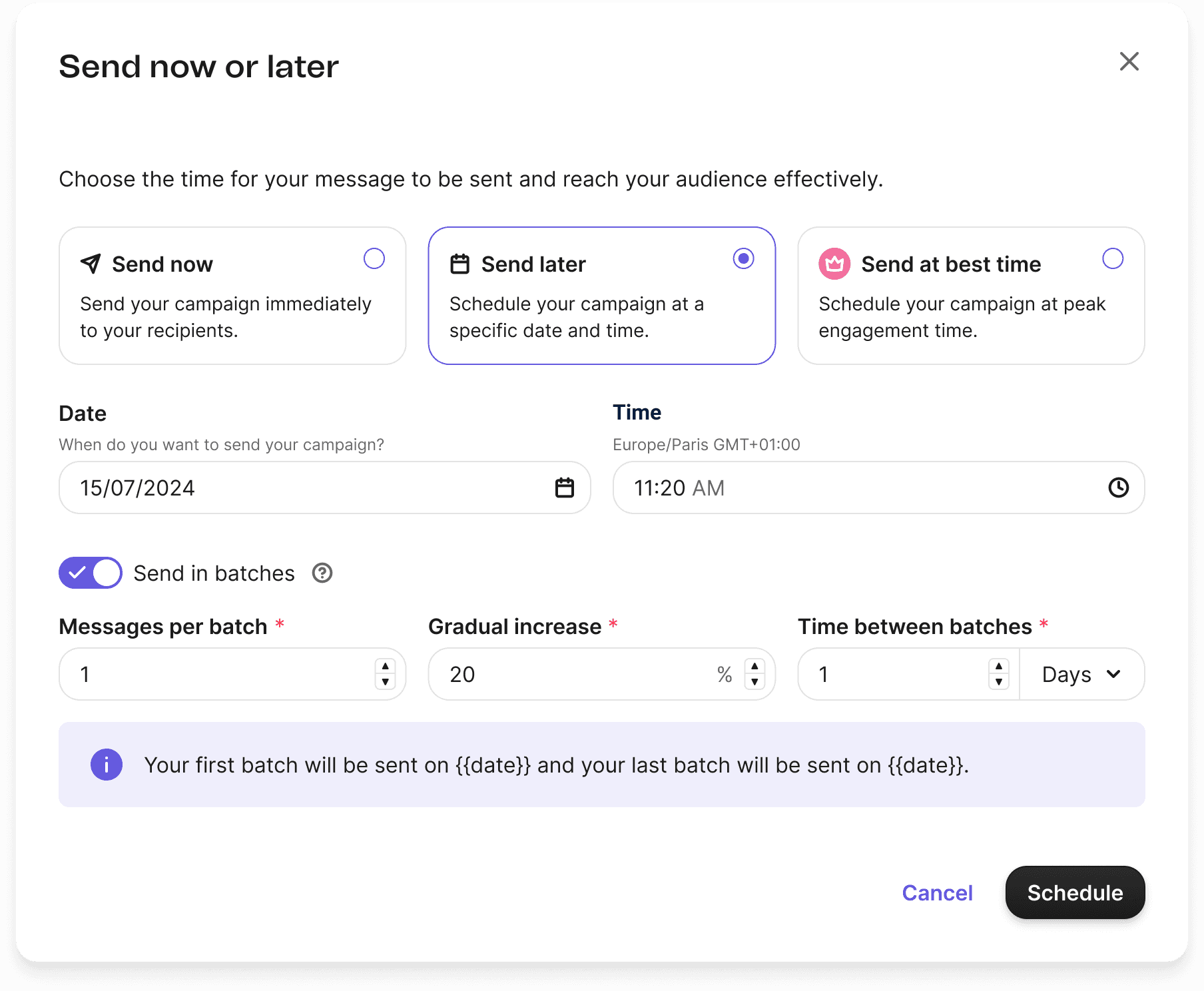 We removed the images, made "Send in Batches" a premium feature, and added descriptions in the radio cards to enhance user awareness and clarify the value proposition.