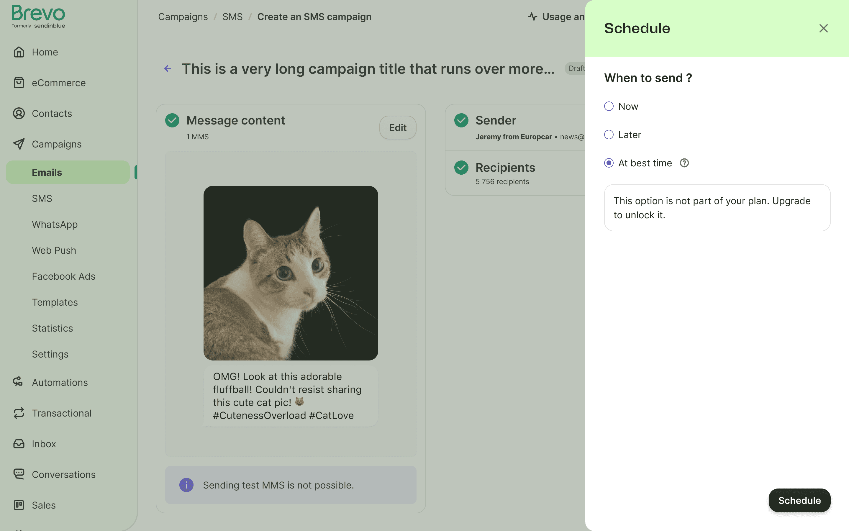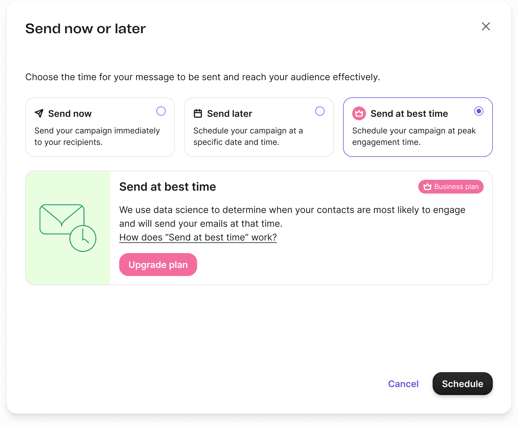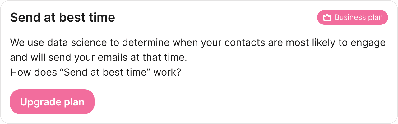 Exploring an upsell card to promote the "Send at Best Time" feature.