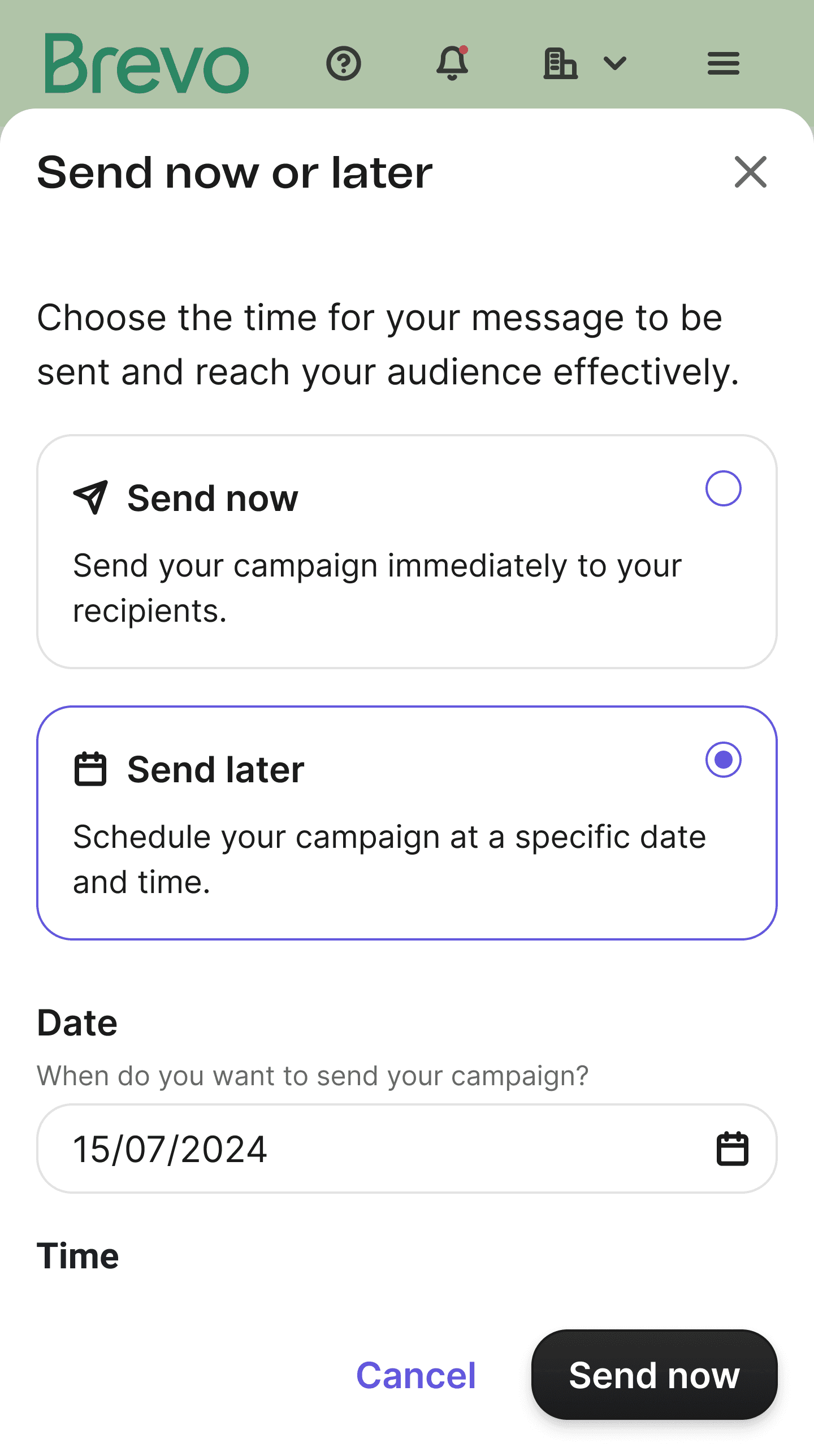 "Send at Best Time" is now clearly visible, even when unselected, with a card that provides a clear explanation of its benefits.