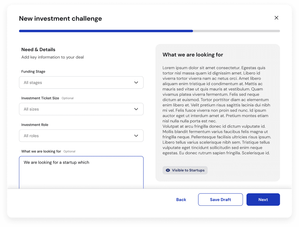 The redesign of the platform yielded significant positive outcomes, leading to a remarkable 53% increase in user retention and a 15% rise in investor sign-ups during the first 3 months. These enhancements not only improved user engagement but also attracted a broader audience of investors, effectively strengthening the platform's ecosystem. This success demonstrates the impact of thoughtful design on user experience and highlights the platform's value in connecting startups and investors.